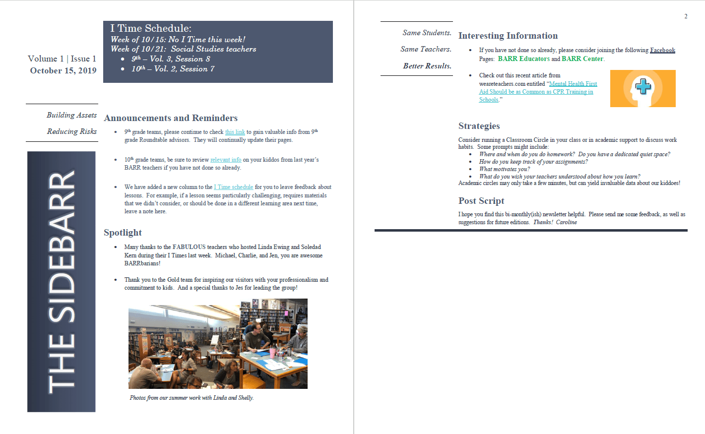 Let’s face it, we all like a room with a little color, a t-shirt to inspire or create community or a bulletin board that is unique. Our students do too. Any time classrooms have something a little extra added to them, kids notice. BARR Coaches notice too. Check out some of the photos BARR Coaches have been taking as they do their visits across the country. Positive postcards, Newsletters with catchy names, bulletin boards, and even candy bars! Maybe it will spark some new ideas for you!
